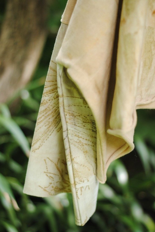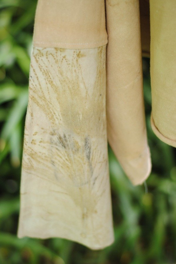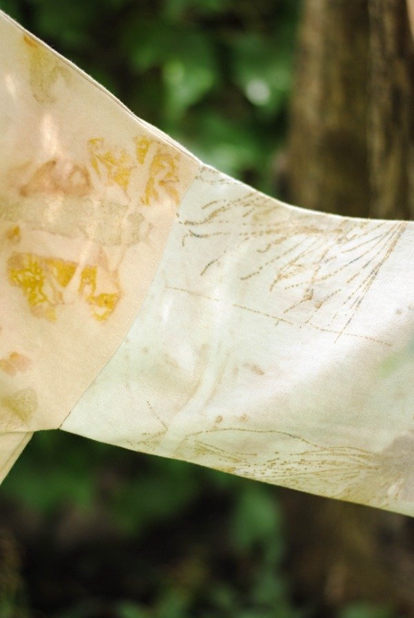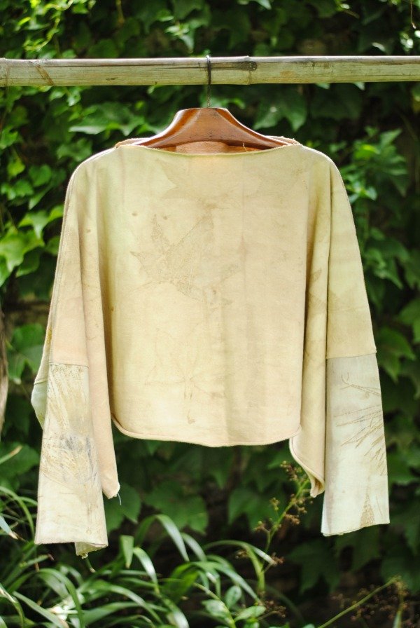 Buzo hecho de descartes textiles de algodón con impresión botánica de hojas de eucalipto, casuarina, lliquidámbar, cáscara de cebolla y tinte natural de carozo de palta.