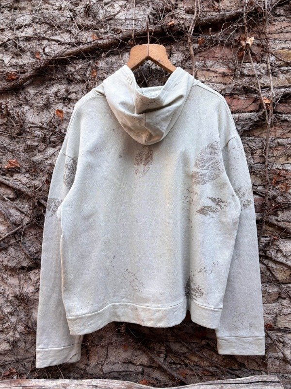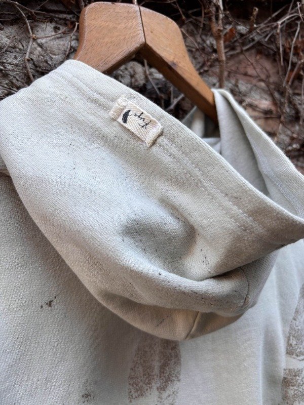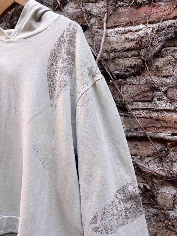 Buzo con capucha de algodón con frisa, con impresión botánica de hojas de árbol de palta y casuarina.