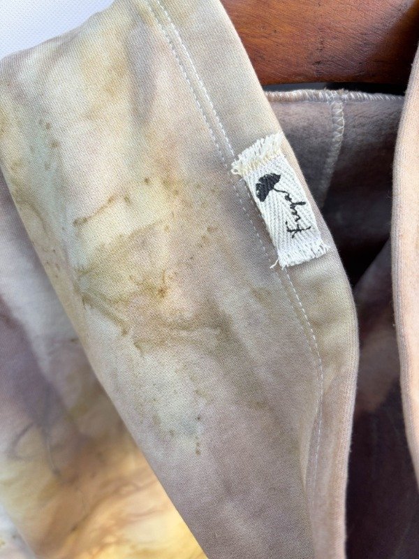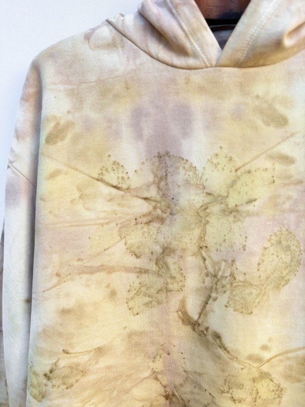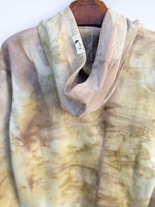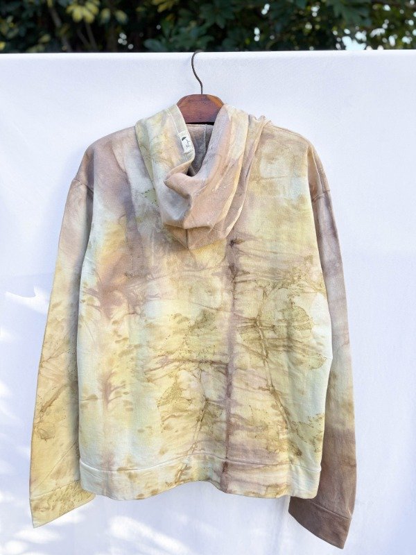 Buzo con capucha de algodón con frisa con impresión botánica de hojas de rosal y tinte natural de carozo de palta.