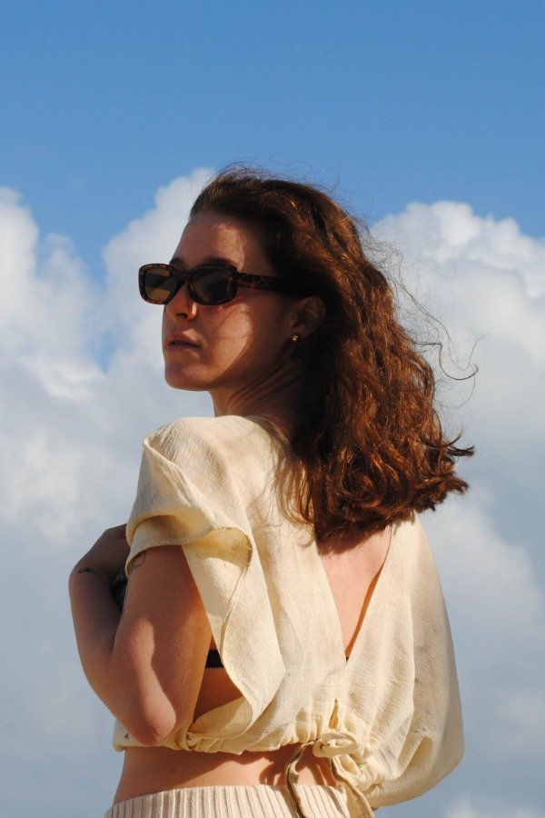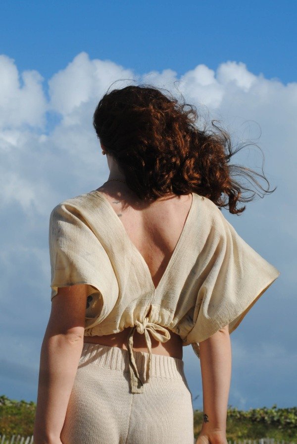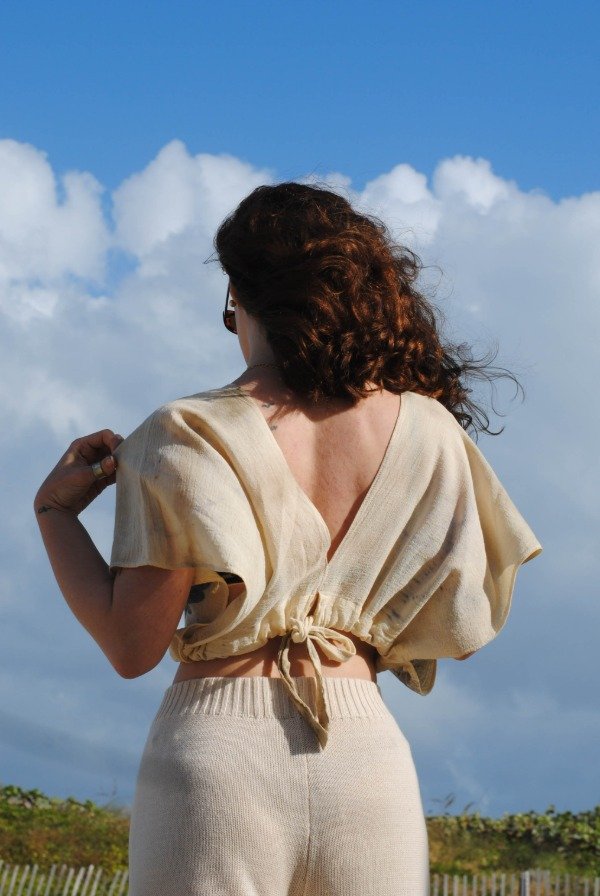 Se ajusta al cuerpo mediante un lazo que se anuda por debajo del busto, permitiendo un calce adaptable. Su estructura minimalista y etérea genera un efecto de ligereza y fluidez en el movimiento.