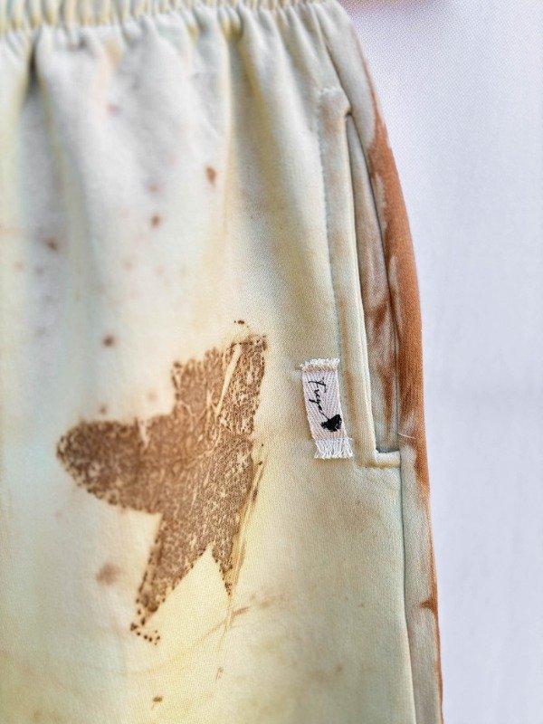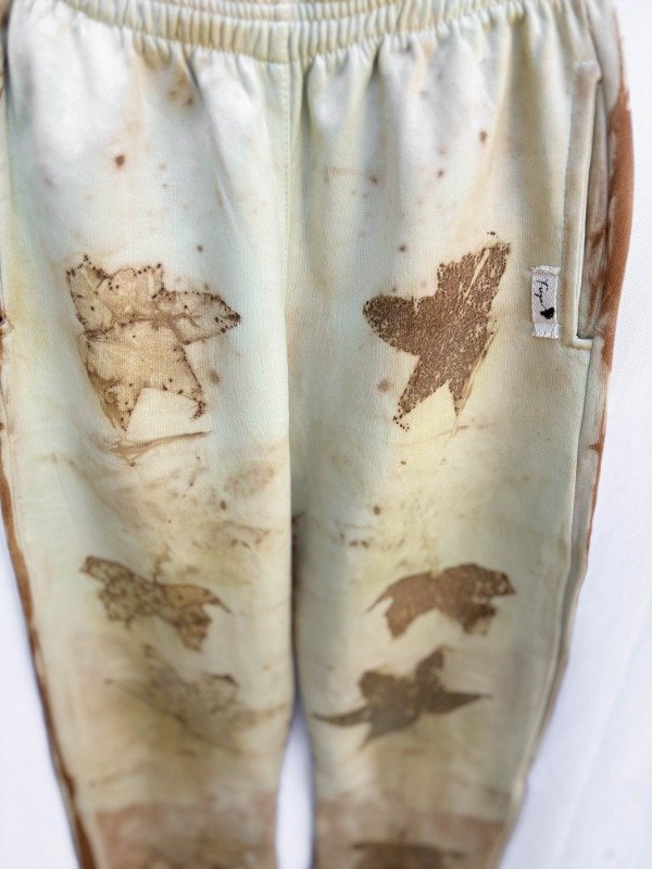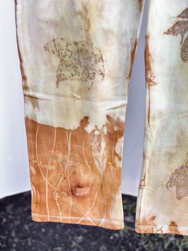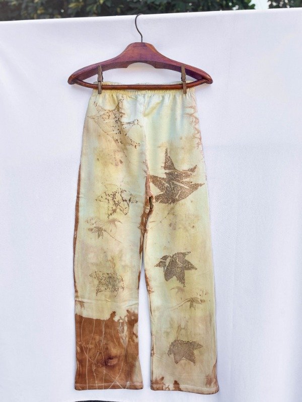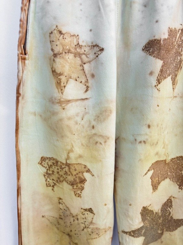 Jogging palazzo de algodón con frisa con impresión botánica de hojas de liquidámbar y tinte natural de cáscara de cebolla. Con bolsillos laterales.