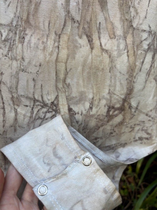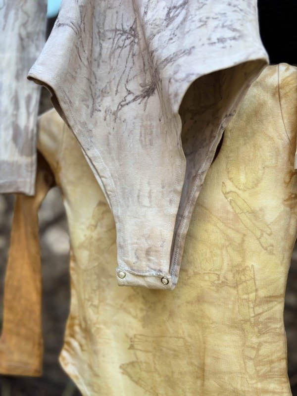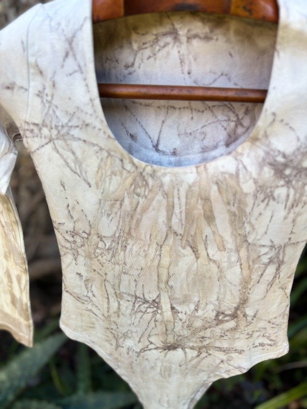 Body manga larga de algodón con lycra, con impresión botánica de casuarina, corteza de eucalipto y tinte natural de corteza de eucalipto. Con broches de metal.