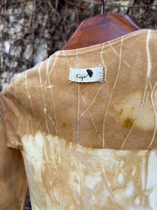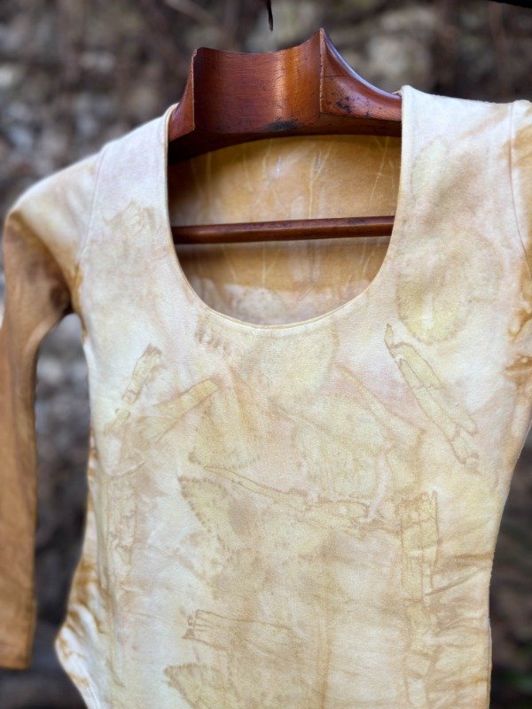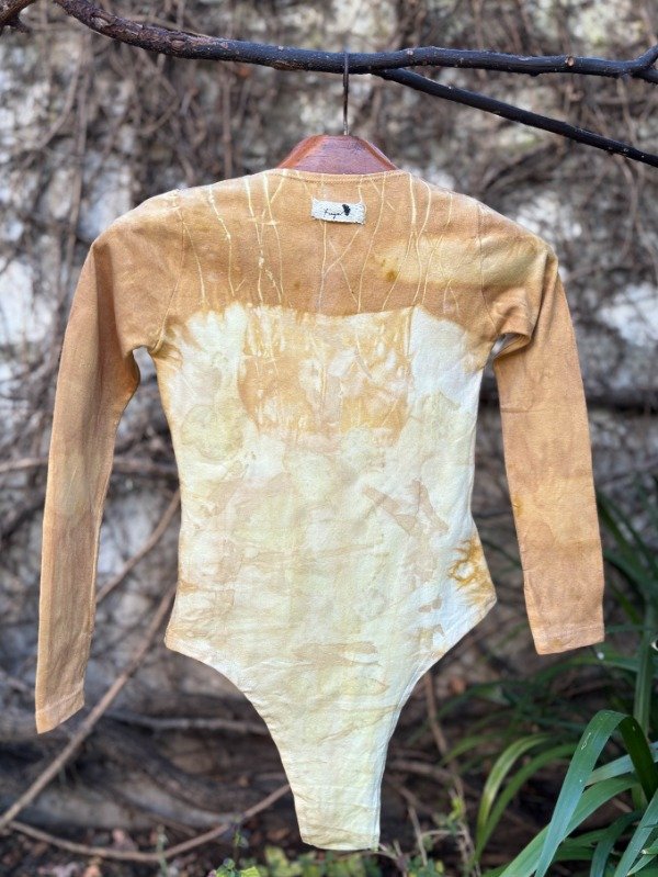 Body manga larga de algodón con lycra, con impresión botánica de hojas de rosal y tinte natural de cáscara de cebolla. Con broches de metal.