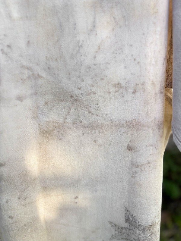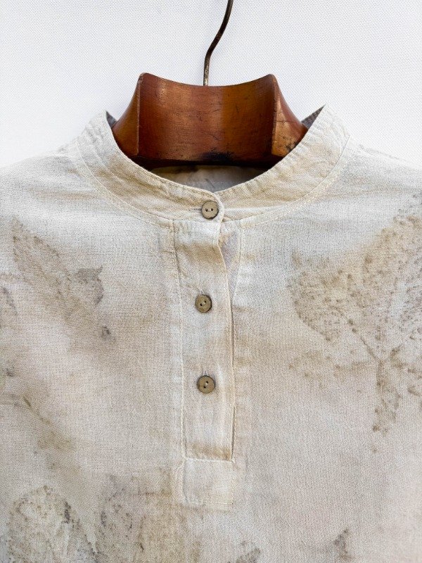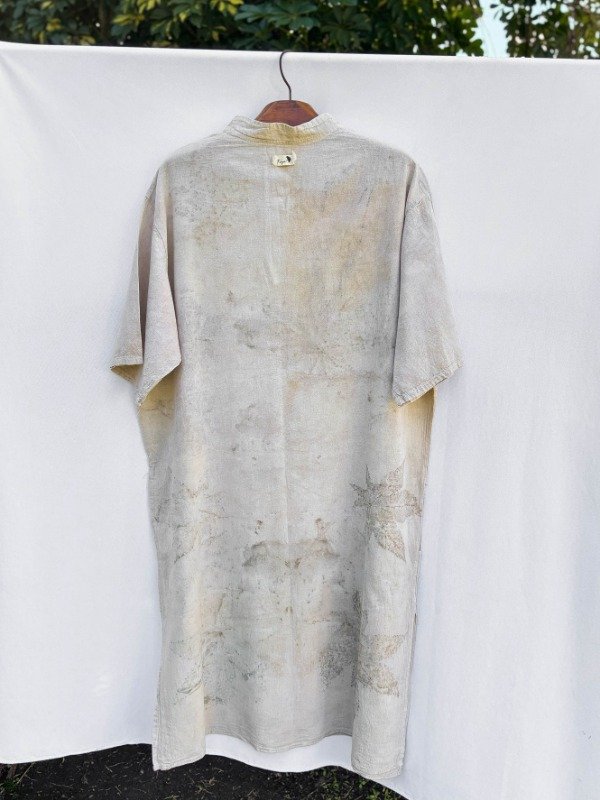 Kurta de gasa con impresión botánica de hojas de árbol de ricino y tinte natural de corteza de eucalipto.