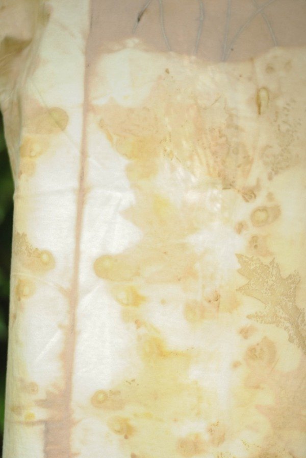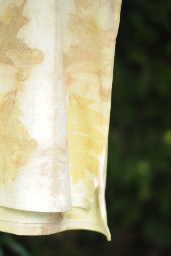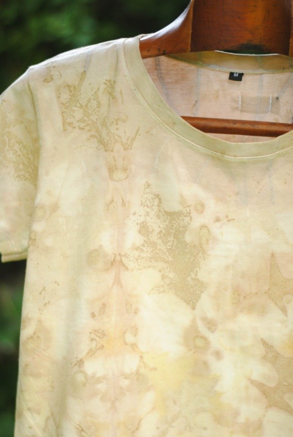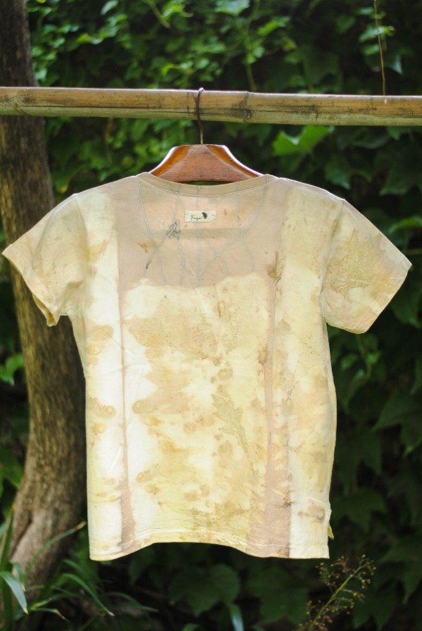 Remera manga corta algodón con impresión botánica de hojas de roble, lagerstroemia y tinte natural de carozo de palta.