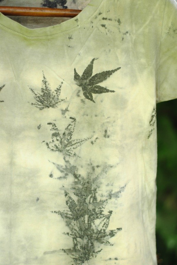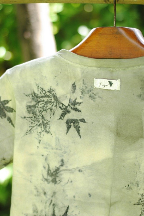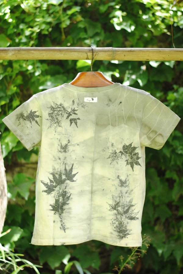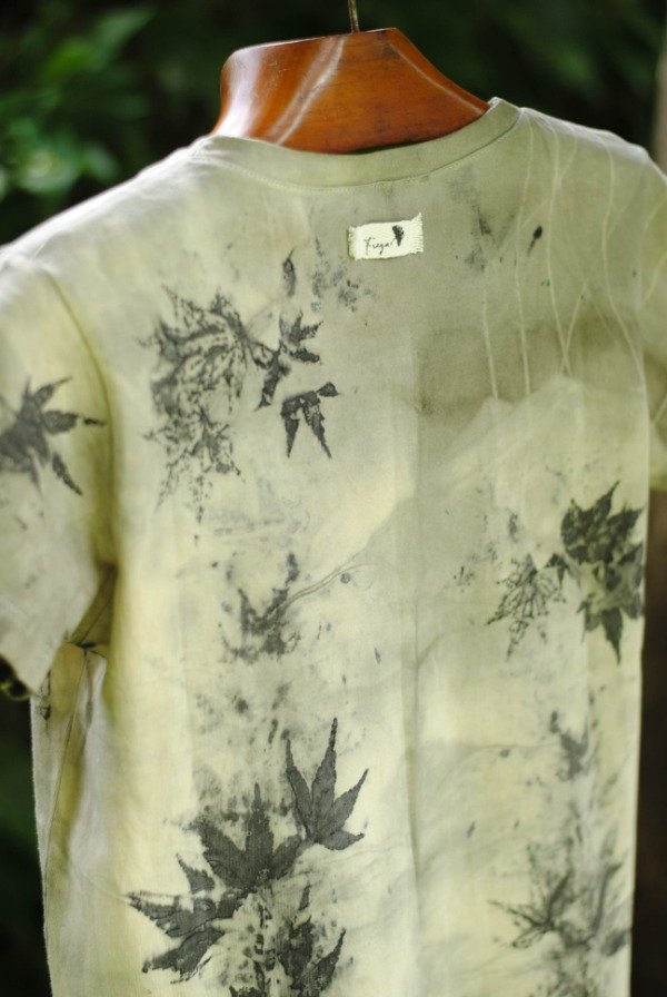Remera de algodón con impresión botánica de hojas de acer japónico y tinte natural de plantas.