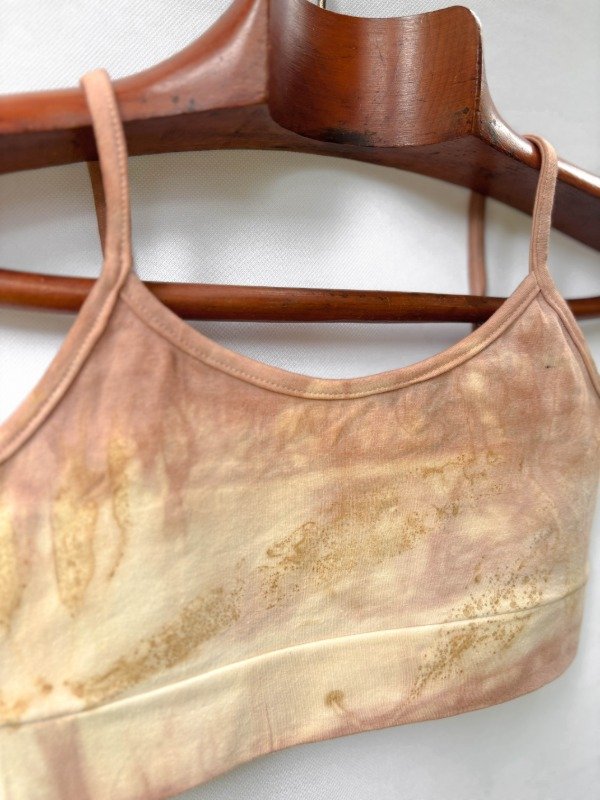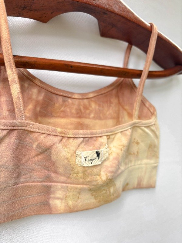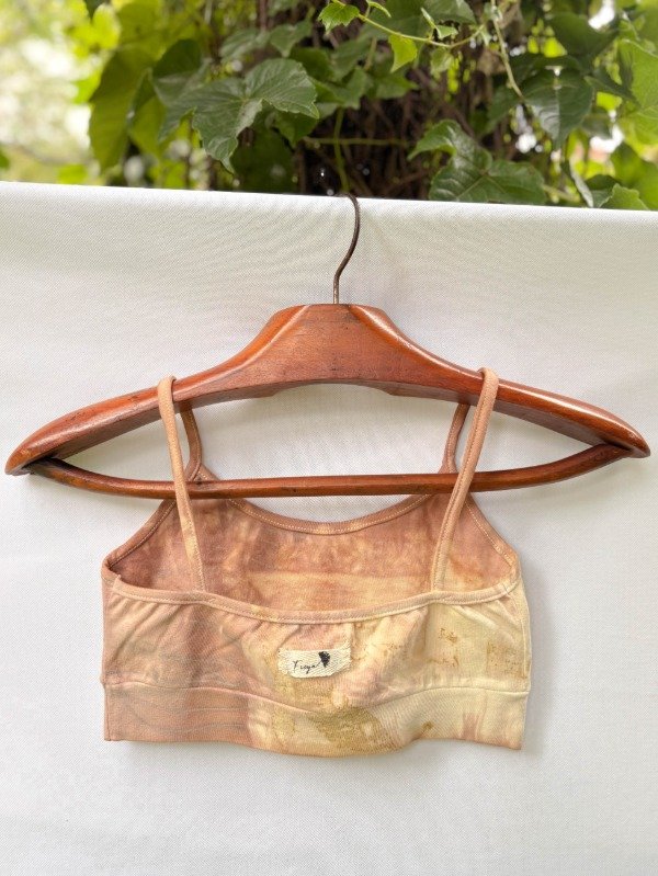 Top deportivo de algodón con lycra, con impresión botánica de hojas de eucalipto y tinte natural de carozo de palta.