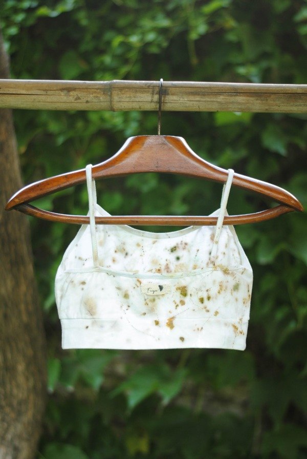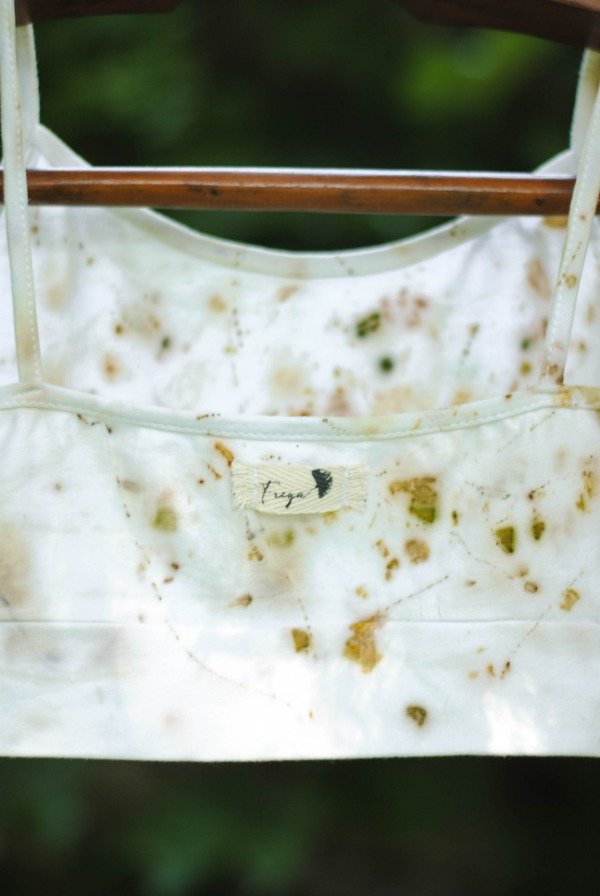 Top de algodón con lycra, con impresión botánica de cáscara de cebolla y casuarina.