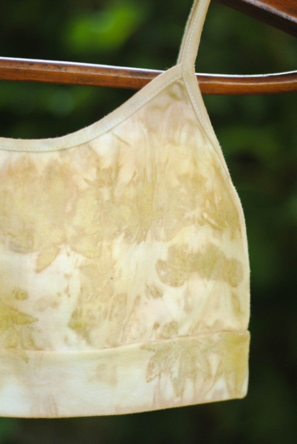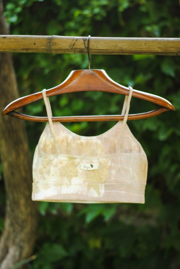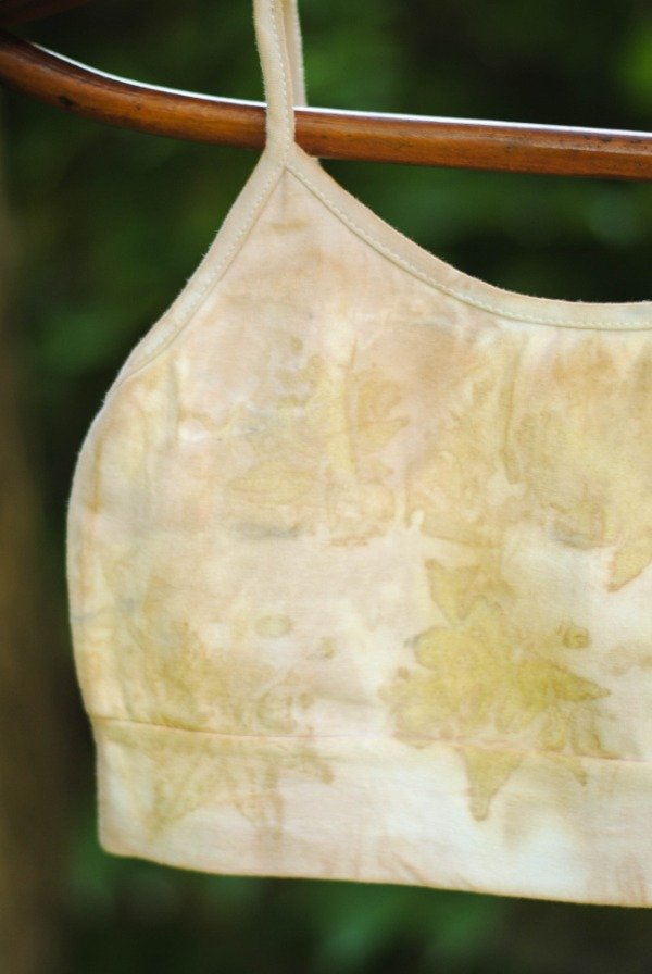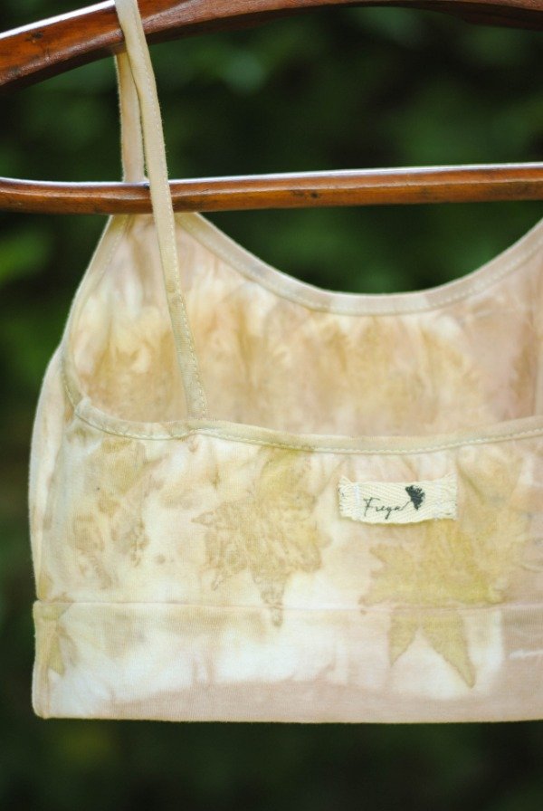 Top de algodón con lycra con impresión botánica de hojas de acer japónico y tinte natural de carozo de palta.
