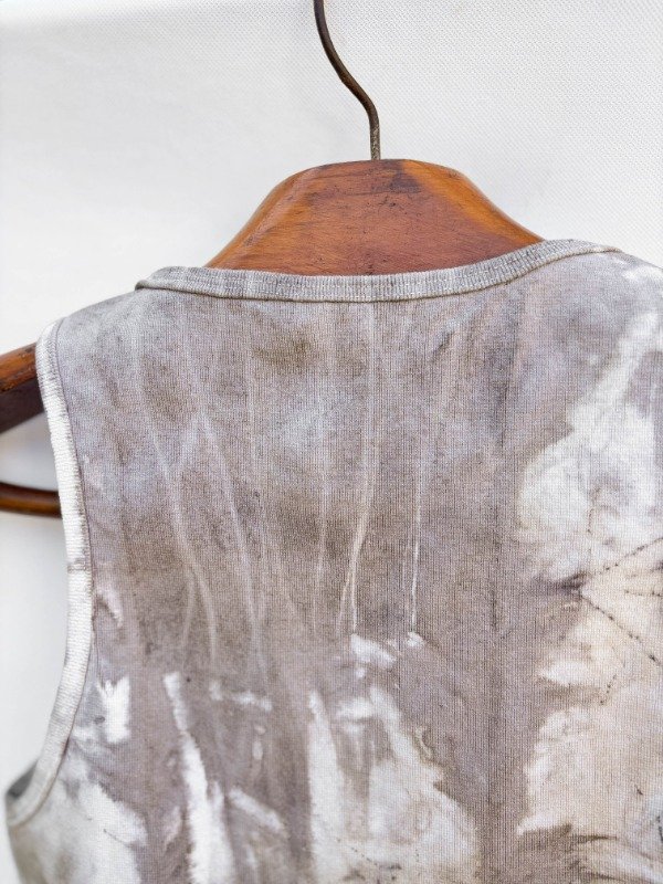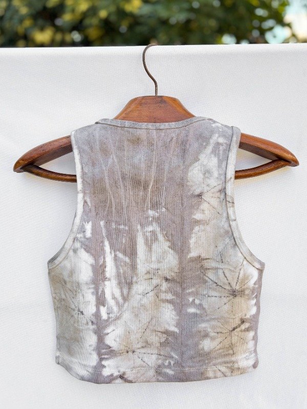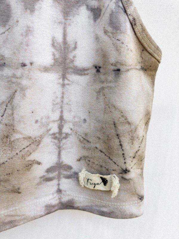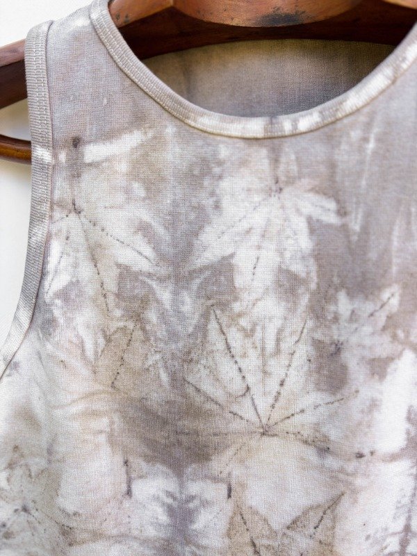 Top de rib de algodón con impresión botánica de hojas de acer japónico y tinte natural de corteza de eucalipto.