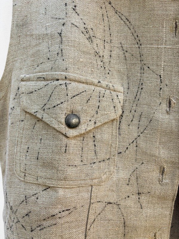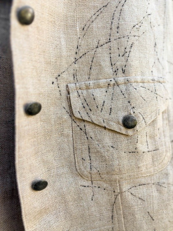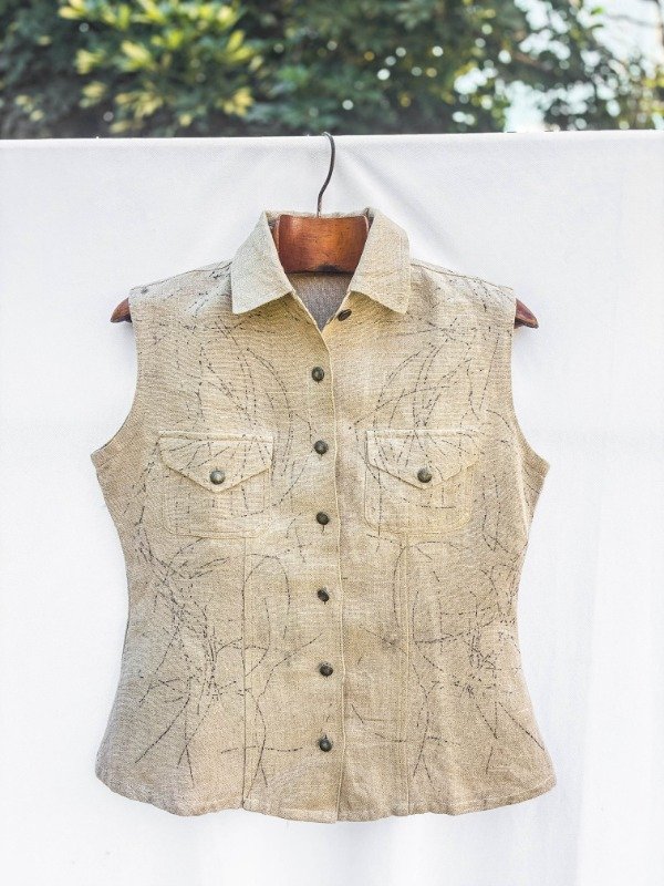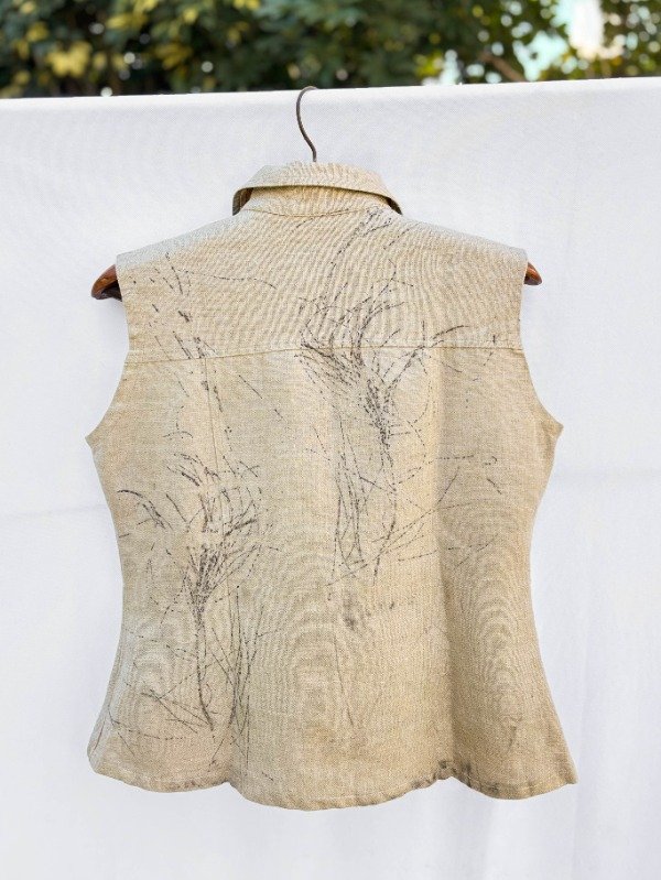 Chaleco de lino con impresión botánica de casuarina. Con bolsillos delanteros y botones de metal.