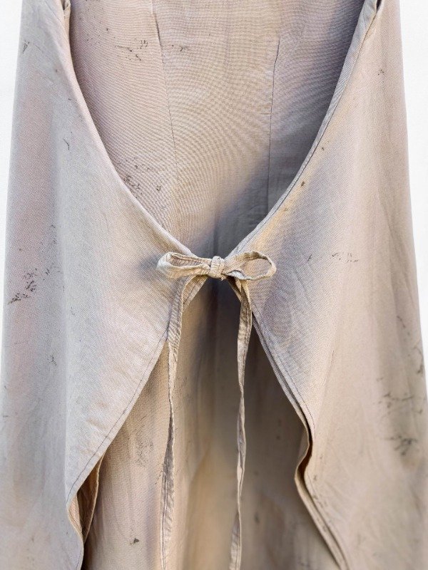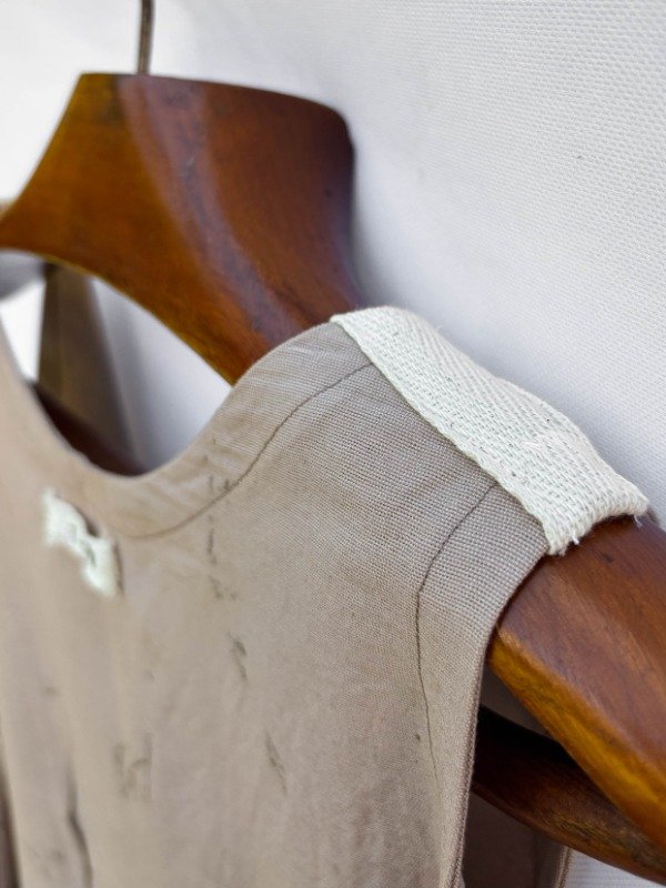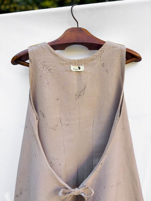 Vestido con impresión botánica de hojas de eucalipto. Con lazos para atar a la altura de la cintura (puede anudarse por delante o por detrás).